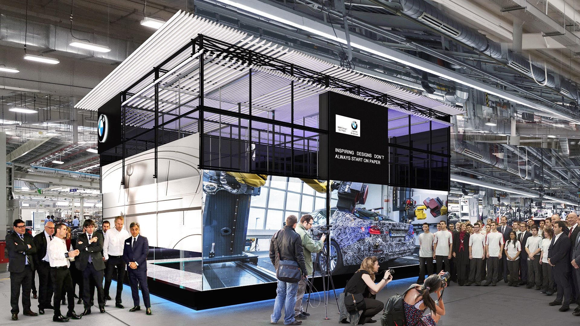 La propuesta hace uso de un sofisticado sistema de andamiajes que permite obtener un espacio totalmente hermético desde su interior o un espacio completamente abierto a los recorridos de la nave industrial donde se construiría.