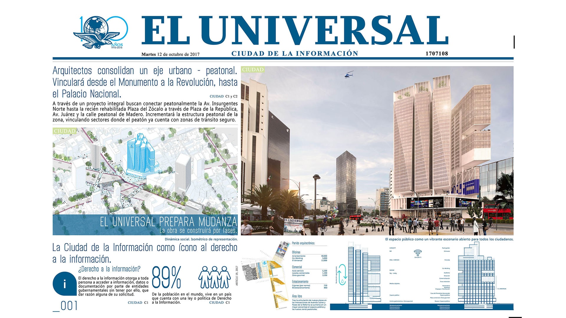 Planteamos en este concurso la posibilidad de consolidar un eje virtual existente y hacerlo peatonal conectando el Monumento a la Revolución con el Palacio Nacional a través de la avenida Juárez y la calle peatonal de Francisco I. Madero. Nuestro punto de articulación recaería en el predio propuesto para la nueva sede de El universal, ubicado en Bucareli y el Paseo de la Reforma.