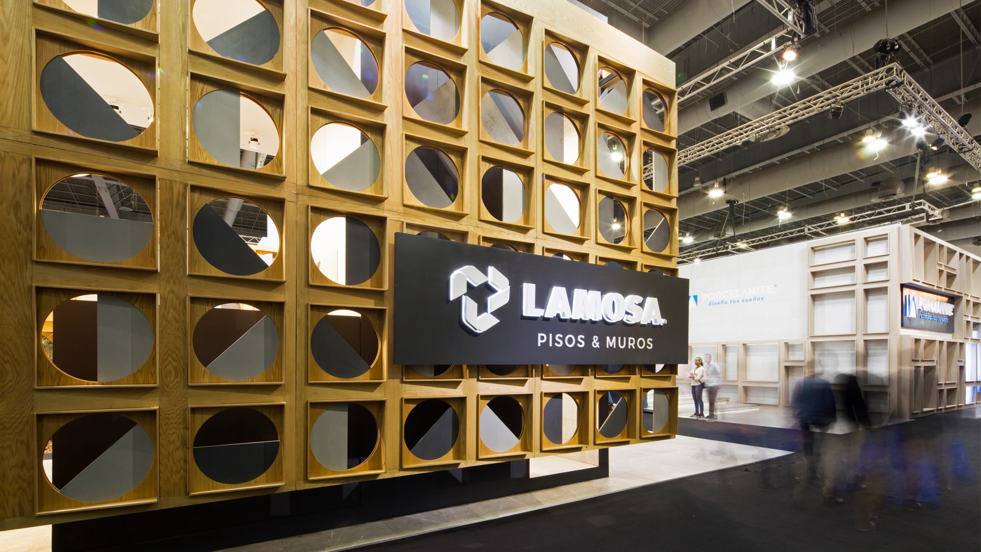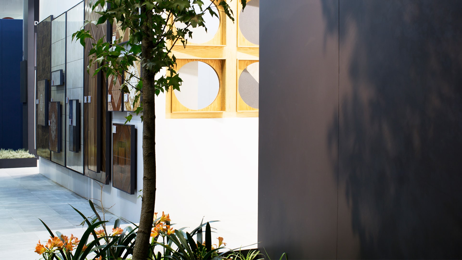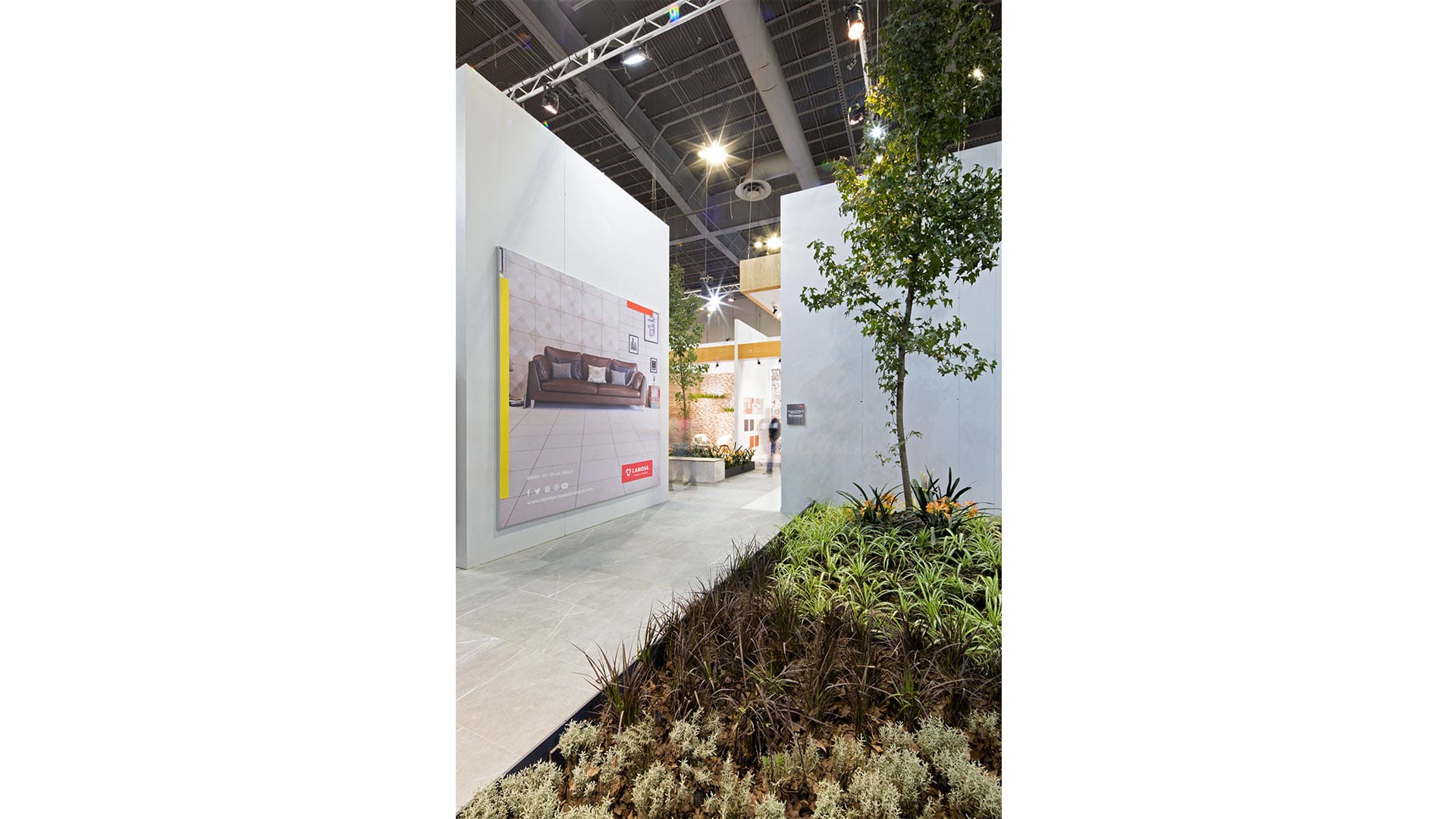 En este proyecto para la marca Lamosa la paleta vegetal hace uso de colores en tonos rojos y anaranjados. Se trata de un proyecto mucho más abierto con un recorrido más libre y dos puntos de encuentro: uno para negocios con mesas de trabajo que se acompañan por un Olivo y otro mucho mayor, configurado como un espacio de contemplación y descanso rodeado de ambientes para la exhibición de materiales.