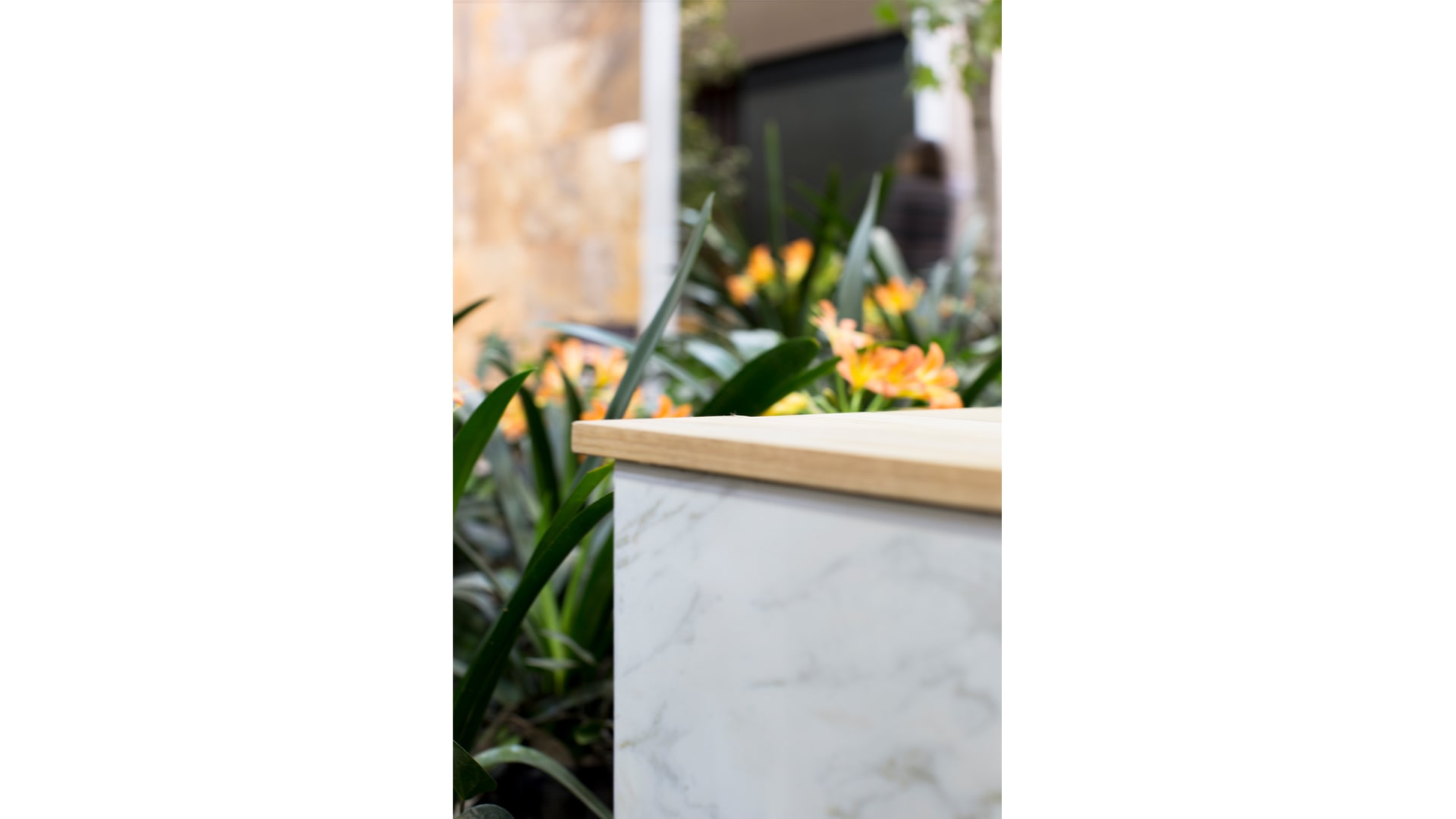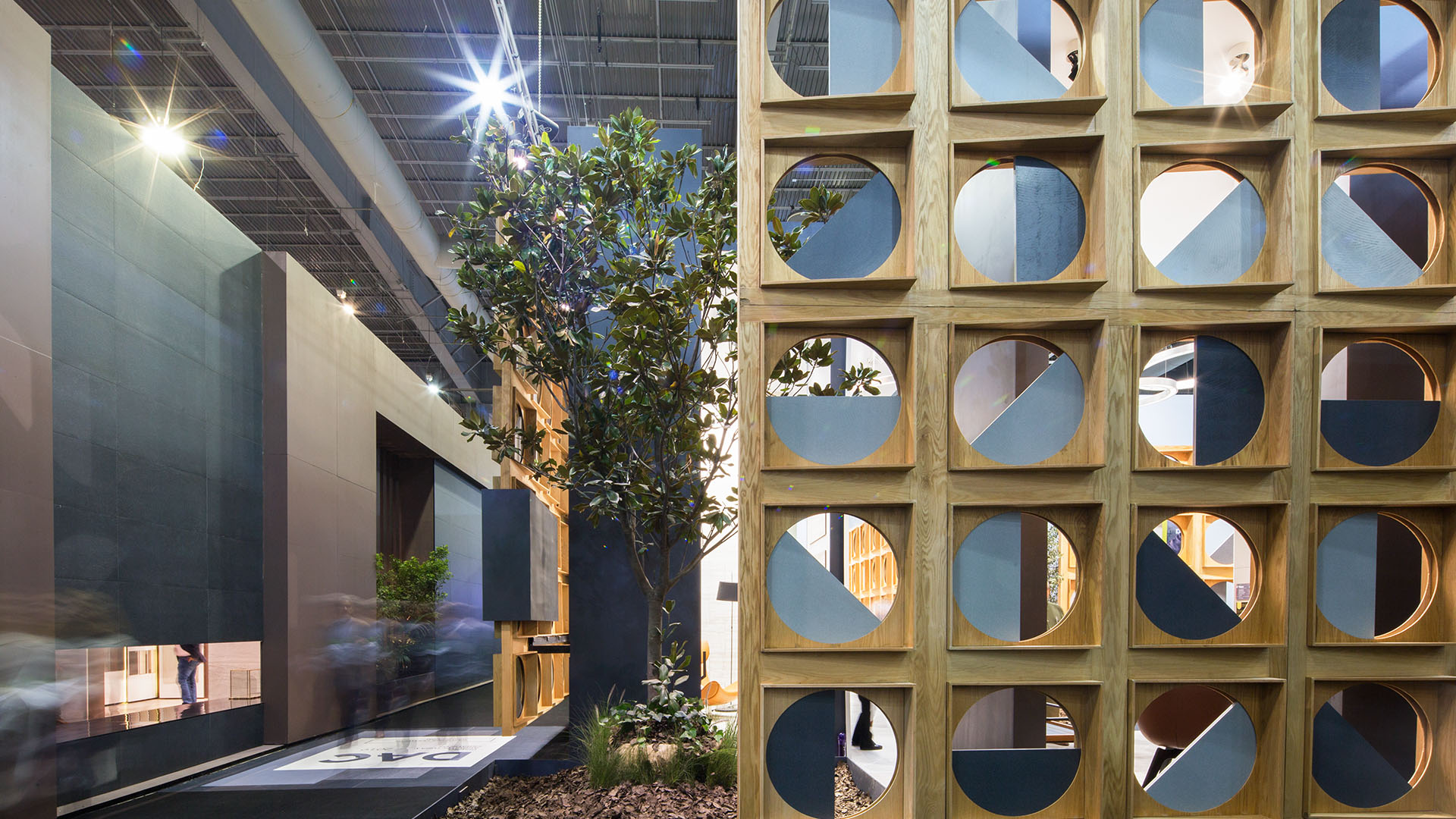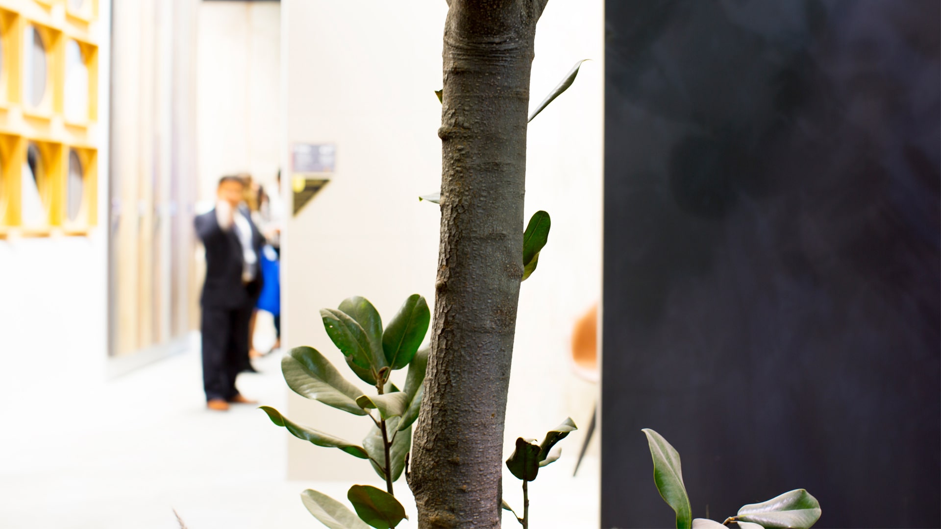 En este proyecto para la marca Lamosa la paleta vegetal hace uso de colores en tonos rojos y anaranjados. Se trata de un proyecto mucho más abierto con un recorrido más libre y dos puntos de encuentro: uno para negocios con mesas de trabajo que se acompañan por un Olivo y otro mucho mayor, configurado como un espacio de contemplación y descanso rodeado de ambientes para la exhibición de materiales.