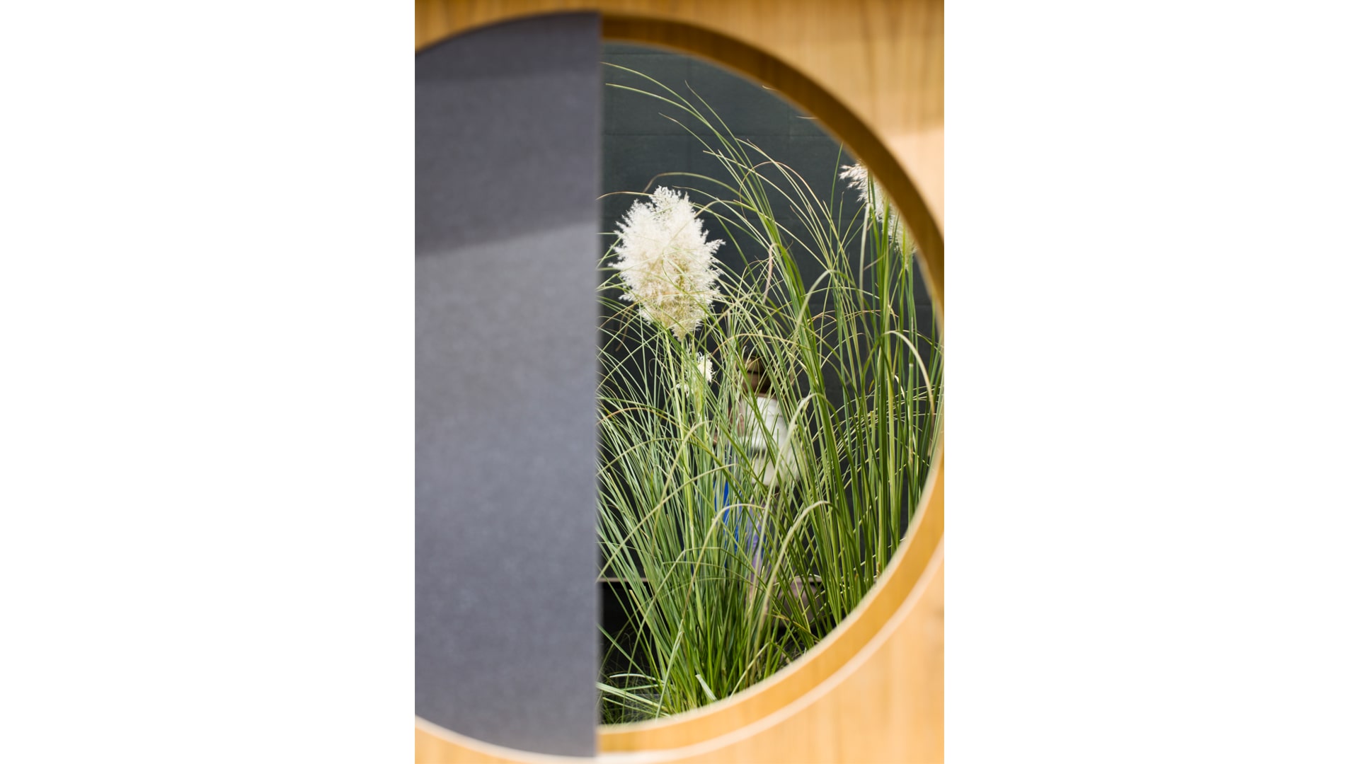 Limitando el stand de la mano de una celosía de madera se encuentran en sus esquinas cuatro jardines, uno jerarquizado por una Magnolia, otros con Pampa Grass.